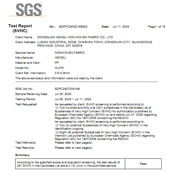 • 無(wú)紡布2024年SGS環(huán)保測(cè)試報(bào)告 注:測(cè)試結(jié)論依賴(lài)于對(duì)高關(guān)注物質(zhì)如硼、鉻、砷等元素含量的檢測(cè)。 ...