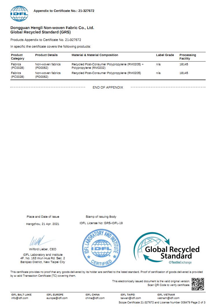 IDEL實驗室與機構(gòu)宣告我司經(jīng)檢查與評估通過全球回收標準(GRS)4.0版本,產(chǎn)品分類符合(紡織類PC0028)標準與工藝(PR0016)標準。